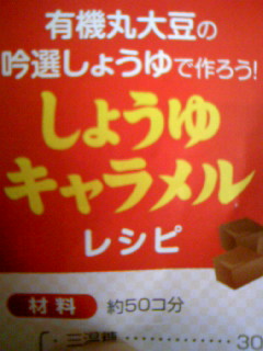 しょうゆキャラメルをスーパーで配っていたので頂戴してきました。うーん。口に入れた瞬間しょうゆの香り、そしてその後は黒飴のような甘み。ひたすら甘い。ちなみに我が家は減塩しょうゆです。よそでしょうゆを使うと辛くて食べれないよ!